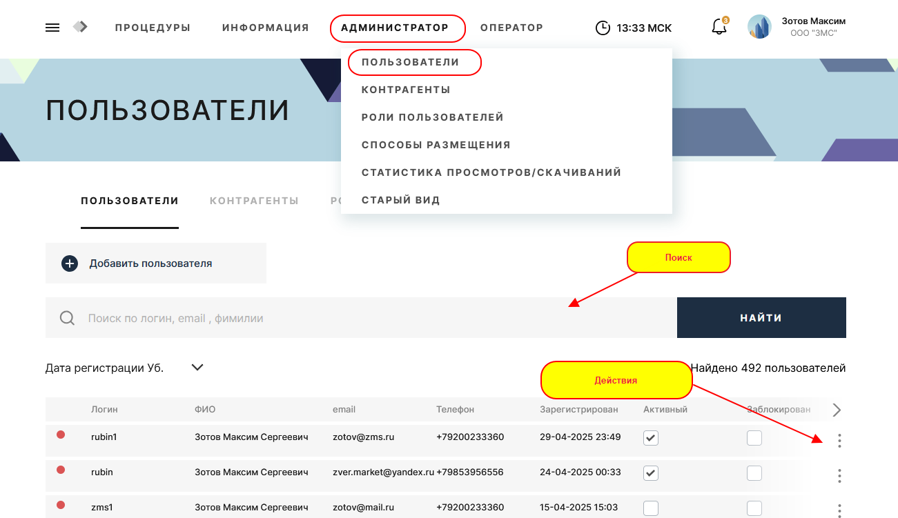 В справочнике "Пользователи" доступен просмотр всех зарегистрированных на ЭТП пользователей.
