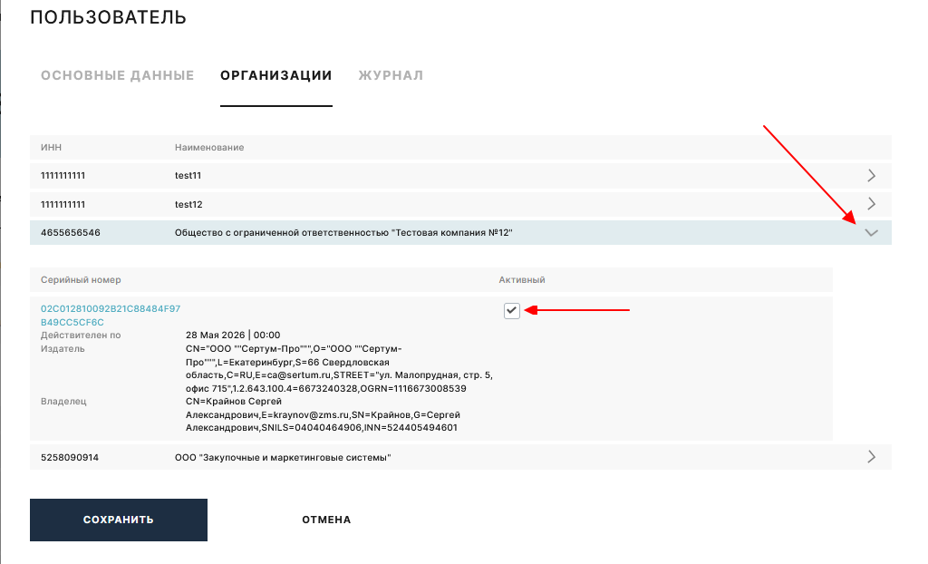 Активация сертификата пользователя выполняется через действие "Изменить" , закладка организации: