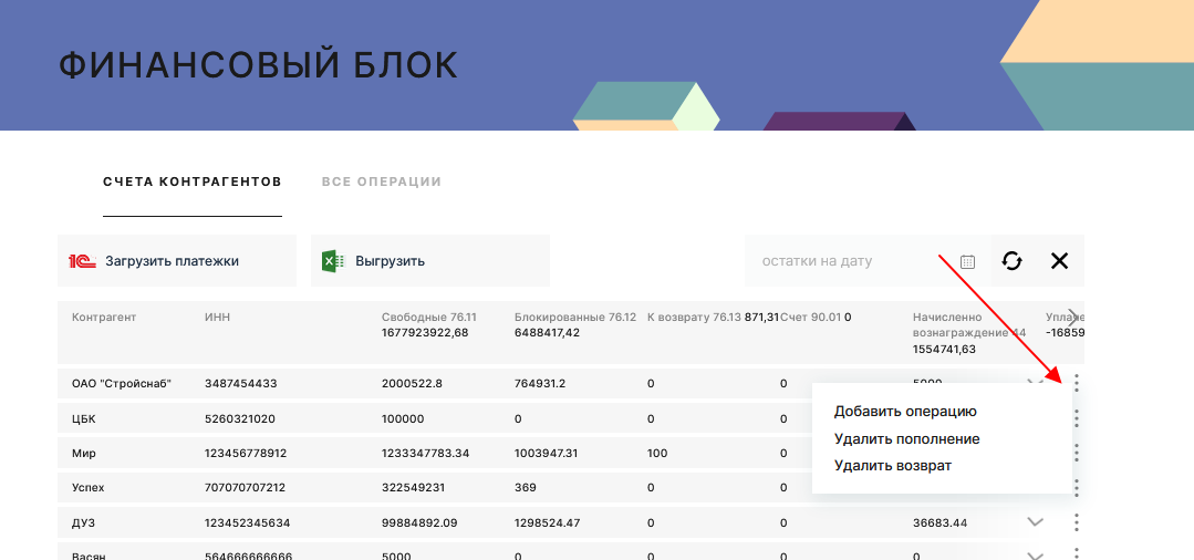 В разделе "Счета контрагентов" доступны действия :