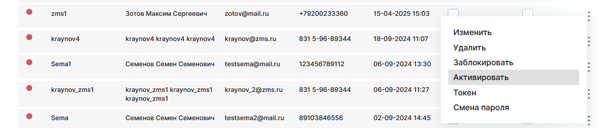 Активировать/Деактивировать- ручная активация пользователя.