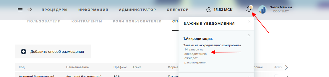 В окне "Важные уведомления" администратору показывается количество поступивших заявок на аккредитацию ожидающих рассмотрения , кликнув на сообщение откроется раздел с заявками.