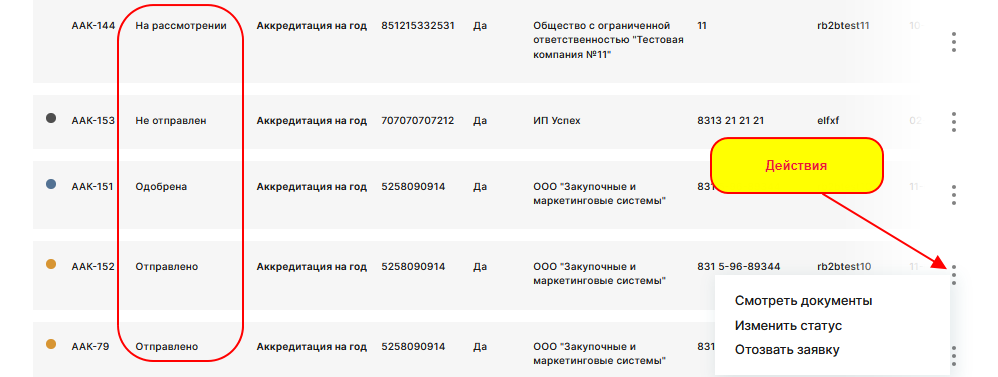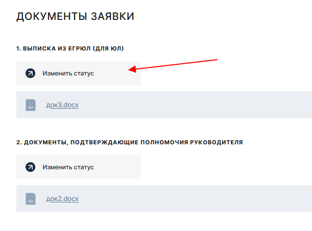 3.После рассмотрения всех документов , через действия над заявкой нужно выбрать "Изменить статус" , заявка переводится в статус "Одобрена" либо "Отклонена".