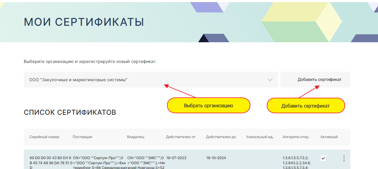 Прежде чем получить ЭП Вы можете: - ознакомиться со следующими разделами: Что нужно знать для применения ЭП Регламент применения ЭП на Электронной торговой площадке. - проверить применимость уже имеющихся у Вас ЭП для работы в нашей системе. Для этого можете сразу перейти к п. 4.1.6 настоящего Руководства. 1. Получение ЭП 1.1. Выберите из списка Удостоверяющих Центров (далее УЦ), поддерживаемых ЭТП, тот, который наиболее удобен для Вас. 1.2. Подготовьте документы, необходимые для получения сертификата. Точный перечень комплектации документов Вам необходимо уточнить в УЦ. Примерный Перечень документов приведен ниже: - Выписка из ЕГРЮЛ (срок действия выписки зависит от УЦ, осуществляющего услуги по выпуску ЭП) — оригинал или нотариально заверенная копия; - Документ, подтверждающий полномочия лица, на имя которого выдается ЭП: • для единоличного исполнительного органа — копия приказа (протокола) о назначении, заверенная подписью уполномоченного лица и печатью организации; • для сотрудника — копия приказа о приеме на работу, заверенная подписью уполномоченного лица и печатью организации, копия доверенности на осуществление действий от имени участника размещения заказа с правом использования ЭП, заверенная подписью уполномоченного лица и печатью организации; для представителя — копия доверенности на осуществление действий от имени участника размещения заказа с правом использования ЭП, заверенная подписью уполномоченного лица и печатью организации; - Копия 2-й и 3-й страниц общегражданского паспорта, а также страницы с указанием последнего места регистрации лица, на имя которого выдается ЭП, заверенная подписью уполномоченного лица и печатью организации. 1.3. Проверьте соответствие рабочего места пользователя требованиям, определенным в п.п.2.1. и 2.2. настоящего Руководства. Определиться с необходимостью установки на рабочее место пользователя программного обеспечения - обязательного для функционирования ЭП, а именно: • КриптоПРО CSP версии 3.0 и выше; • КриптоАрм. 1.4. Подайте заявку на получение ЭП и приобретение при необходимости программного обеспечения, указанного в п. 4.1.3. настоящего Руководства в выбранном УЦ. Правила и порядок подачи заявок регламентируется УЦ. При обращении в УЦ необходимо обязательно уточнить что ЭП необходима для работы на ЭТП. 1.5. Получите сертификат в УЦ. Способ получения ЭП согласовывается с УЦ. 1.6. Настройте компьютер пользователя ЭТП для работы с ЭП в соответствии с п. 2 настоящего Руководства. 1.7. Проверьте применимость полученной ЭП на ЭТП и зарегистрируйте ЭП в соответствии с п 4.2. настоящего Руководства. 2. Регистрация ЭП Существует два способа зарегистрировать Вашу ЭП на ЭТП: • непосредственная регистрация ЭП (требуется только для дополнительной ЭП , первоначальная регистрация ЭП осуществляется при подаче заявки на акрредитацию): • первоначальная регистрация ЭП при аккредитации Вашей организации как Участник, или как Организатор в соответствии с п 5. настоящего Руководства. Теперь Вы можете участвовать в электронном документообороте ЭТП. 2.1. необходимо открыть пункт меню «Личный кабинет» затем пункт меню « Сертификаты ». 2.2. В открывшемся окне в верхнем левом поле выберете организацию (контрагента), для который Вы хотите зарегистрировать сертификат. 2.3. Нажмите кнопку «Добавить сертификат». 2.4. В