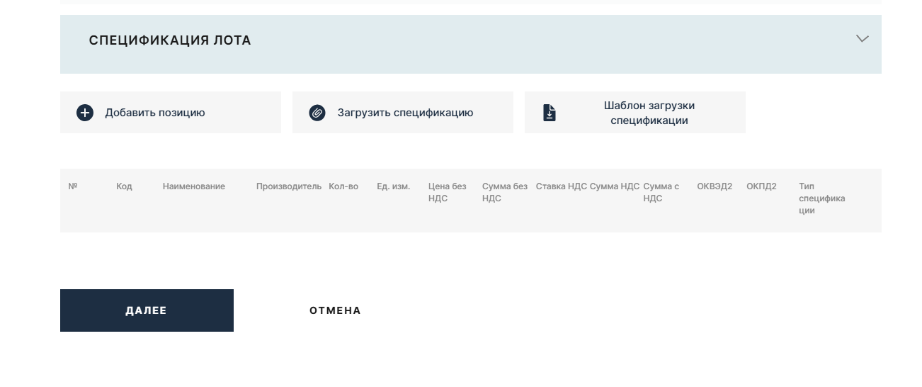 - На вкладке «Спецификация» заполните