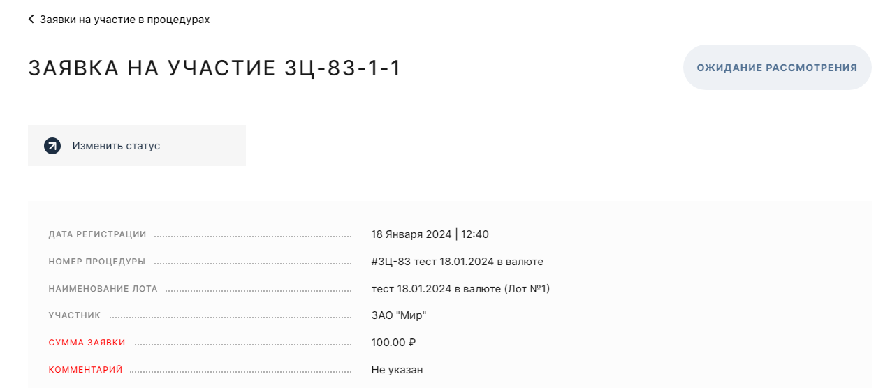 рассмотрения заявок. В окне процедуры доступна кнопка