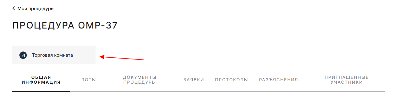 раздела «Мои процедуры» , на странице процедуры торгов